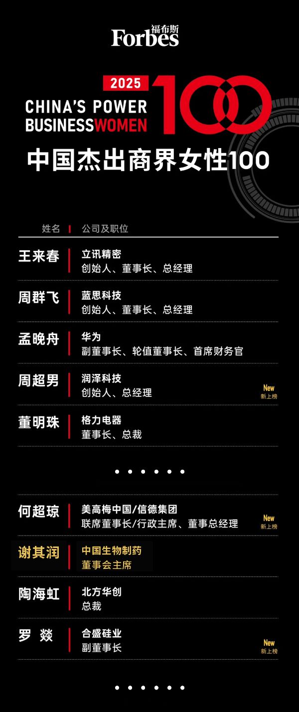 Recently, the 2025 "Forbes China's Top 100 Outstanding Businesswomen" list was officially released. Ms. Theresa Tse, Chairwoman of the Board of Sino Biopharm (1177.HK), was named to the list, marking the seventh time she has been honored with this award. Over the past 10 years, Ms. Theresa Tse has led Sino Biopharm, while upholding the philosophy of "Science for a healthier world", to continuously invest in and promote technological innovation and product R&D. The company is dedicated to bringing the safest, most effective, and affordable new and high-quality drugs to the public, contributing to the Healthy China initiative.