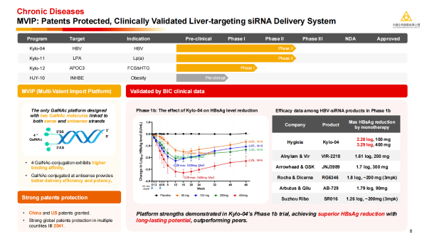 · Kylo-04: Developed based on the MVIP platform, Kylo-04 achieved a superior reduction in HBsAg (hepatitis B surface antigen) compared to its peers in a Phase 1b clinical trial for the treatment of hepatitis B (HBV), with a reduction of up to 3.29 log in the 400 mg dose group, demonstrating excellent efficacy, durability, and the high delivery efficiency of the MVIP platform.