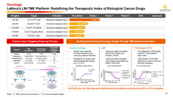 Dr. Qin Ying introduced that the core competitiveness of LaNova Medicines lies in its unique LM-TME platform. This platform aims to solve a fundamental challenge in the field of tumor biologics: how to reduce systemic toxicity while maintaining potent killing effects. The LM-TME platform utilizes the characteristic that the concentration of certain biochemical factors (R-factors) in tumor tissue is much higher than in normal tissue to design TME-selectively activated antibody drugs, thereby "revitalizing" targets like CTLA-4 that have historically been limited by toxicity. Furthermore, LM-TME is currently the only known TME-dependent antibody discovery platform that covers three drug formats: monoclonal antibodies (mAb), Antibody-Drug Conjugates (ADCs), and T-cell Engagers (TCEs). It is a powerful engine for developing differentiated innovative biologics.