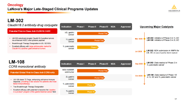 · LM-302: A CLDN18.2 ADC with global First-in-Class (FIC) potential, has received Breakthrough Therapy Designation for the treatment of advanced or metastatic gastric or gastroesophageal junction adenocarcinoma. LM-302 is scheduled to initiate a Phase 3 clinical trial in 1L gastric cancer in March 2026 and is expected to submit a marketing application to the National Medical Products Administration (NMPA) for ≥3L gastric cancer in mid-2026. The latest research data for the 1L pancreatic cancer are expected to be read out this year.