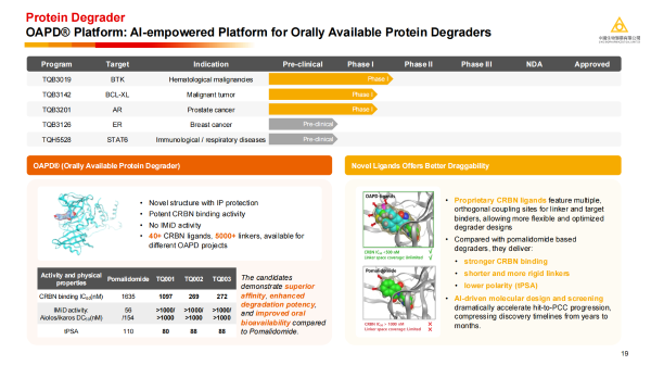 · TQB3019: An oral, BTK-targeting Proteolysis-targeting chimera (PROTAC) drug with an oral bioavailability of up to 40% in animal models. In the first dosing cohort of the Phase 1 study, 4 of 5 patients achieved partial responses across mantle cell lymphoma (MCL), follicular lymphoma (FL), and chronic lymphocytic leukaemia (CLL). Pharmacodynamic analyses showed near-complete BTK degradation.