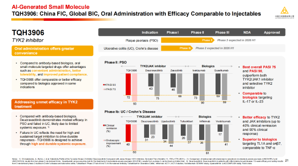 · TQH3906: A new-generation oral TYK2 inhibitor. In a Phase 2 study for plaque psoriasis, it achieved PASI-75 and PASI-90 response rates of up to 93% and 72%, respectively, comparable to biologics. In Phase 1b data for ulcerative colitis, it demonstrated a clinical remission rate of 40%, surpassing similar drugs. The company plans to initiate a Phase 3 head-to-head study against an existing TYK2 inhibitor for the treatment of psoriasis in the first half of 2026. A Phase 2 study for ulcerative colitis will also be conducted concurrently.